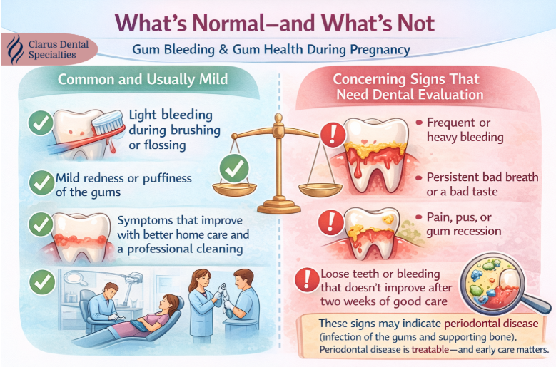 Some gum bleeding during pregnancy can be common, particularly when brushing or flossing. However, not all bleeding should be dismissed.