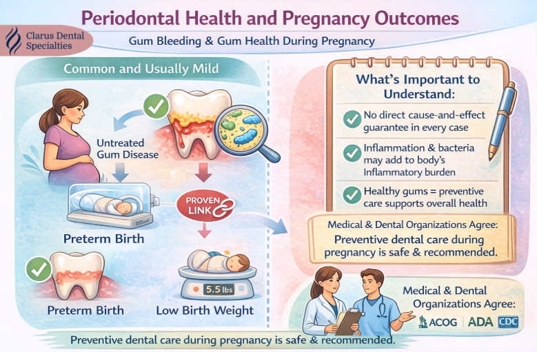 If you’re pregnant and experiencing bleeding gums, schedule a consultation with the specialists at Clarus Dental Specialties to receive safe, expert care for your oral health during pregnancy.