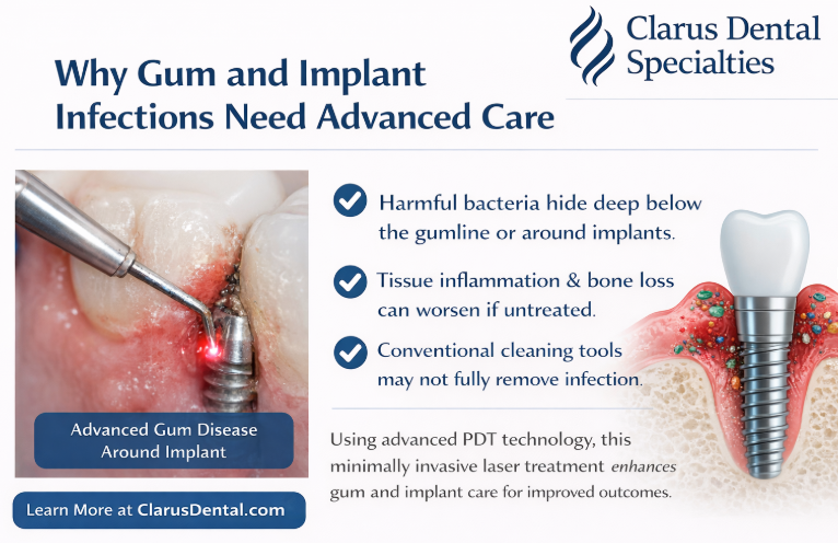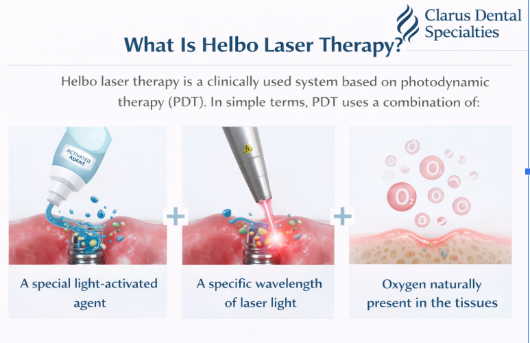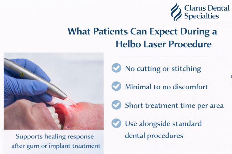Helbo laser therapy has been studied and used internationally as an adjunct in periodontal and implant care. At Clarus Dental Specialties, its use follows established clinical protocols and careful case selection.