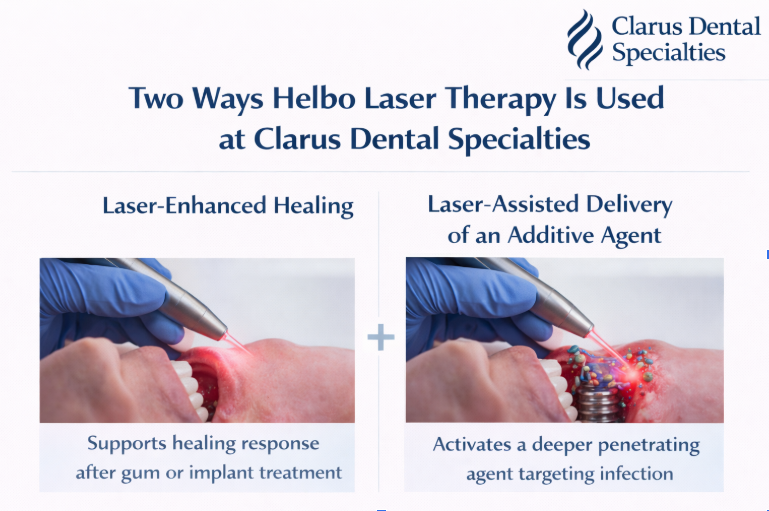 At Clarus Dental Specialties, Helbo laser technology is used in two complementary modalities, depending on the patient’s clinical needs.