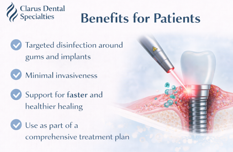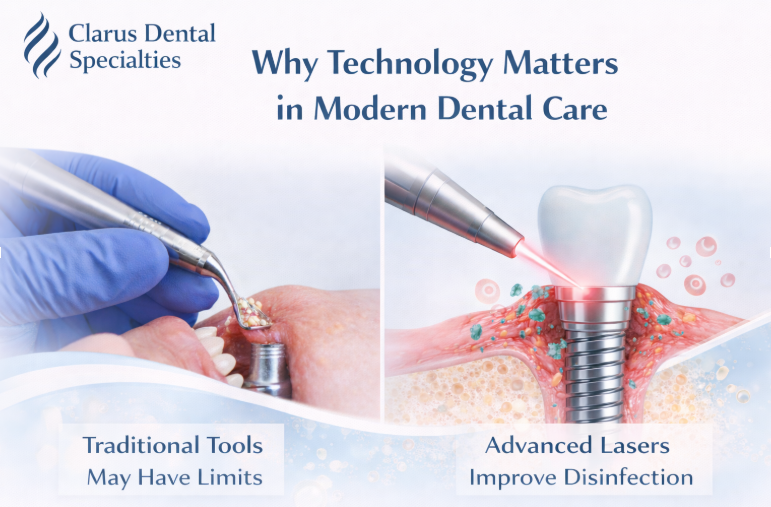 Modern adjunctive technologies help overcome these challenges. At Clarus Dental Specialties, advanced tools are integrated into established treatments offered under Periodontics & Gum Care to enhance bacterial control and support healthier tissue healing. The goal is not to replace standard care, but to strengthen it using well-chosen technology.