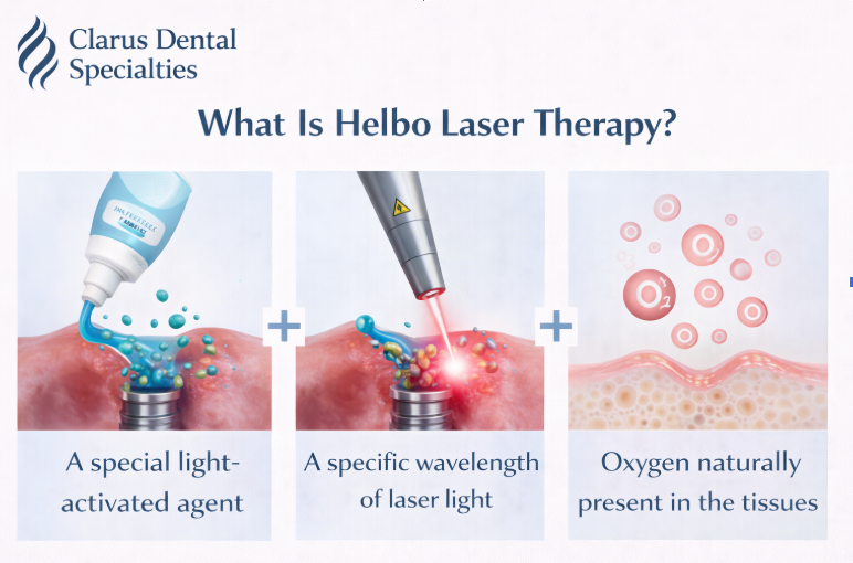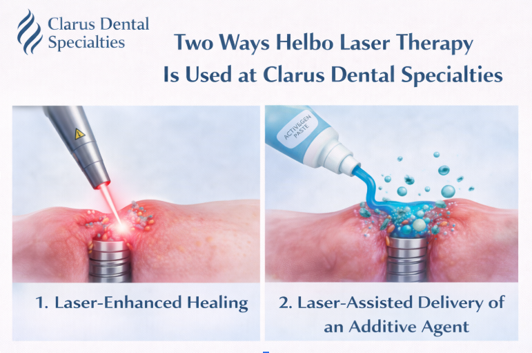 Helbo laser therapy is used as an adjunct to conventional dental procedures and fits seamlessly within the broader scope of treatments available at Clarus Dental Specialties.